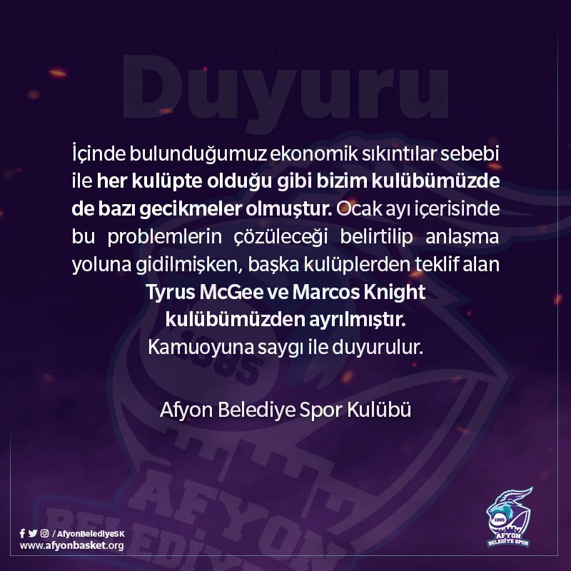 Basketfaul’ün haberine göre takımın iki skorer Amerikalı oyuncusu Marcos Knight ile Tyrus McGee maaşlarını alamadıkları için sözleşmelerini tek taraflı olarak feshederek kulüpten ayrıldılar.